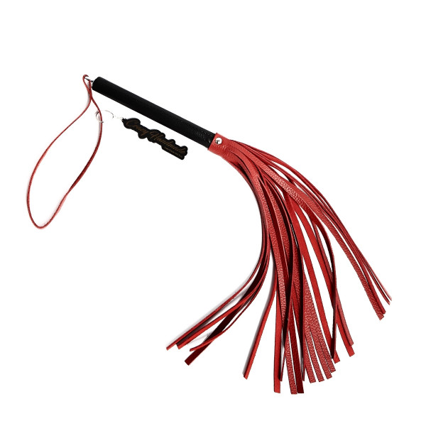 Удобная многохвостная плеть выполнена из натуральной кожи в красном цвете с контрастной черной ручкой