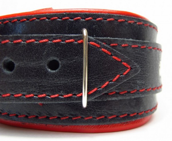 Снаружи ошей­ник выполнен из натуральной толстой ременной кожи черного цвета. Декорирован контрастной грубой строчкой красного цвета. Выглядит провокационно, как на нежной женской шейке, так и на мужской!
